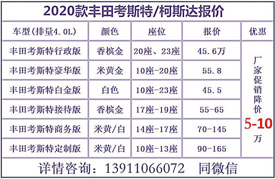 进口丰田考斯特最新售价12座优惠20万丰田考斯特(配置|询价)4s店联系电话,北京东方众威原创全国销售,[10座][11座][12座][13座][14座][15座][16座][17座][18座][20座]◤丰田考斯特◢销售改装10座(高级版)11座(豪华版、行政版、VIP版)12座(高级版、旗舰版、VIP版)13座(VIP版、至尊版),北京东方众威原创丰田考斯特内饰改装奢华高档,适合视察工作,团体活动,高端会议接待用车等等,购车咨询电话:13911066072汤经理 同微信