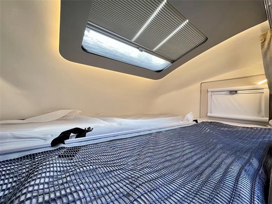 尾部横床的设计方面,为照顾到我们懒人的使用,特别安装导轨,在拓展机构打开收起时自动铺上、收纳床垫,全电动控制,突出一个便利。床垫也是选用的4D防螨空气床垫,柔软舒适。床铺下方安装3kg洗衣机,带烘干功能,并直连尾部贯通储物仓,从车内就可拿取物品。车内温控主要依靠进口驻车变频顶置空调及进口埃贝赫驻车燃油暖风热水一体机(带高原模式)保障。