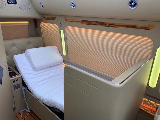 同时还首次设计了隐藏式的鞋柜和隐藏式的车载式保险柜。这辆车车厢后部还配备有车载空气净化器,以此打造出最舒适的的车内环境。 这辆车根据车载特性的需要和显示器厂家定制的前后两台LED液晶显示屏,和车厢后部公司最新研发的头等舱级电动座椅床,电动控制可变床可变座椅,以及豪华房车级卫生间的配备,带有换气扇、马桶、智能电控垃圾桶。卫生间的一侧设计了一处高尔夫设备及行李放置台,底部加高的处理和绑带的设计看上去非常高大上。实力大厂,值得信赖,欢迎来电详询!专业改装顾问为您服务!质量担保,价格优惠。提供板车运输服务了解更多改装方案欢迎咨询!