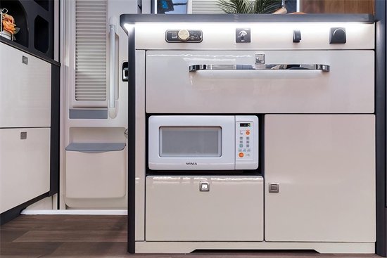厨房区位于进门处,料理台面配备洗菜盆、电磁炉、软管式水龙头等,操作台尺寸高达630×1630(mm),另外还增加了侧方延伸板,操作空间宽裕。厨台顶部的吊柜被取消,取而代之的是一款KME 48V直流变频空调,在使用的时候需要将吊柜门打开,获得更快速的冷气流通。厨房下方集成了储物柜,便于存储调料、碗筷等琐碎物品。