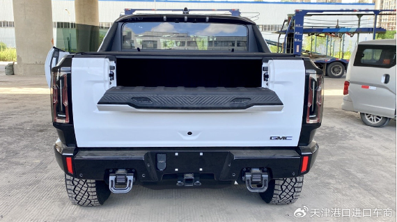 车尾的部分同样辨识度极高,除了采用与过去悍马车型相似的设计,还有造型独特的H形尾灯,灯带内部还雕刻有“Hummer EV”的标识。另外,其还有多功能尾门,可以实现两段式开启,完全打开后可以获得一个梯子,便于上下货箱拿取物品,非常实用。