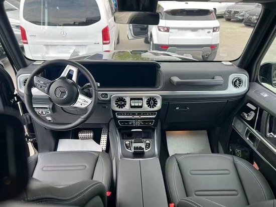 内饰设计方面,全新一代G级的内饰设计更加注重豪华氛围的营造,与上代G级车型的粗狂线条相比,内饰氛围年轻了许多。采用的是连体大屏,中控台上采用了非常硬气的轮廓,空调出风口采用了涡喷发动机式的风格,副驾驶一侧还有一个扶手设计。方向盘采用了运动化底设计,3/9点位置还采用了打孔皮质包裹,增强摩擦力的同时更是让视觉效果得到了明显提升,12.3英寸中央液晶屏并未搭载最新的奔驰MBUX人机交互系统,还在沿用Command系统,不过系统支持CarPlay互联功能。