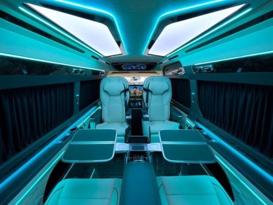 带3C认证-航空头等舱 功能:通风、加热、气动按摩、二级腿拖、轻质化全冲压骨架 内饰整体风格造型设计 半隔断造型吧台(触摸控制屏、杯托、纸抽盒) 一键电动升降高清电视 吊顶显示屏(显示车辆实时状态) 电动伸缩烧水壶(220V大功率) 车顶造型三色顶灯 顶部满天星(打孔皮质软包工艺) 星空款定制壁灯 三排定制中央扶手马鞍(伸缩触摸屏、电动隐藏保险箱、隐藏式杯托、隐藏折叠小桌板、后备箱储物盒) 三排定制侧壁造型扶手(无线充电) 车规级专用整车线束(卡扣对接、更安全) JBL高级音响(DSP处理器、低音炮) 高档双层隐私窗帘(隐藏滑道) 全车强化隔音降噪,直降20-25分贝 ……等等