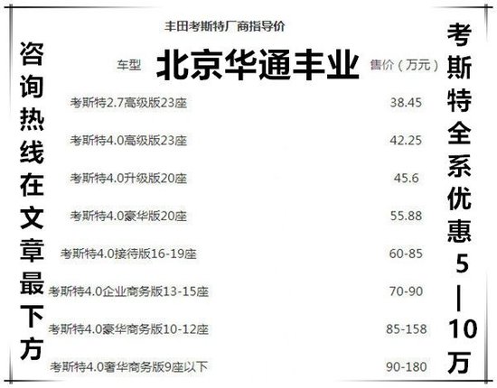 丰田专卖店新款考斯特9座、10座、11座、12座、13座、15座、16座、17座、19座、20座、23座华通丰业现车销售,豪华内饰改装。丰田考斯特11座至尊版、柯斯达 (配置|询价)12座(奢华版、旗舰版、VIP版)13座(VIP版、超VIP尊贵版、至尊旗舰版)16座(超VIP版、超VIP商务版)17座(VIP版、超VIP商务版)颜色米黄金属色、合格证与座位相符!销售热线:13011185333 魏经理 同微信