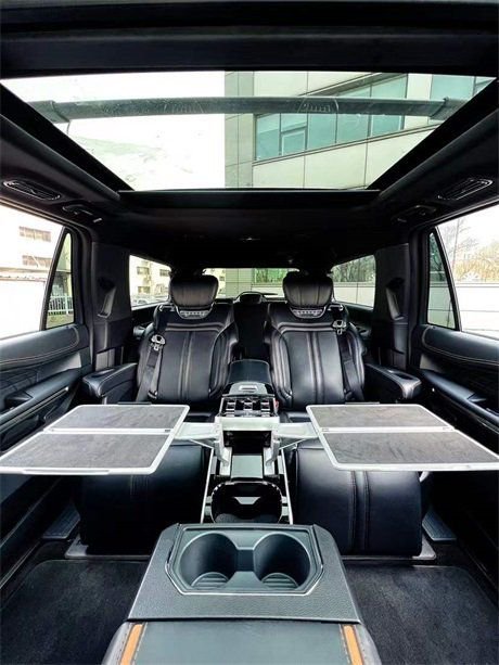 配置:座椅一排,二排,三排全是电动,12.4英寸全液晶仪表、15.5 英寸中控触摸屏、前排主副座椅通风/36项按摩,加热/方向盘加热,全景天窗、电动真皮方向盘、方向盘加热、电动踏板、电动折叠第三排座、四驱、带有自动紧急制动的预碰撞辅助(带车辆和行人检测)、带镀铬横杆的不锈钢车顶架导轨、Easy Fuel 无盖密封燃油加注系统、油门刹车踏板电动调节、带自清洁功能的 360° 摄像头、自清洁倒车摄像头、拖车摇摆控制、带停走的自适应巡航控制、胎压监测、车道保持系统、B O 音频22 个扬声器、AppleCarplay、AndroidAuto、无钥匙进入、座椅记忆、隐私玻璃、遥启、自动调光后视镜、雨量感应雨刷、带记忆的电动调节踏板、22轮、360°环影、无线充电、七种驾驶模式、后差速锁、二排座椅采用宽体航空座椅设计、宽大舒适、纳帕小牛皮包覆、配备通风、加热,气动按摩 、无线充电、电动升降头枕。小桌板,氛围灯,扶手功能:触摸屏控制、6升压缩机冰箱、无线充电+双USB充电、原车天窗控、座椅姿势3种记忆、一键折叠,轻松上下三排