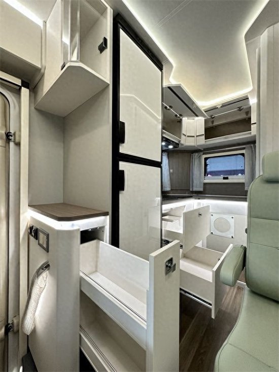 生活区后方依然是L型超大厨房区域,外侧由一组150升冰箱进行格挡,形成一个独立空间,内部提供了抽油烟机、电磁炉、洗菜池等基础设备,下方则是一个和尾部厨房相通的储物柜,在车内拿取比较方便。