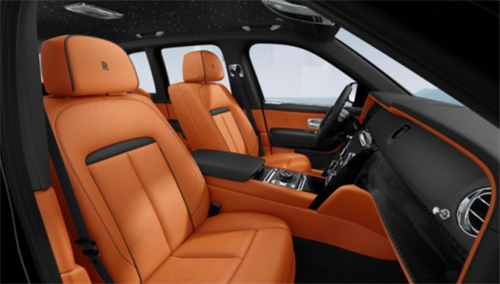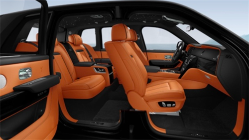 劳斯莱斯库里南 座椅设计彰显劳斯莱斯汽车的品质与工艺,简洁而现代的马蹄铁图案,强调座椅的支撑力。整体椅背由一整张皮料精心塑形,打造出极为立体的表面。后排两个独立座椅之间设有后排中央固定扶手,可容纳带有劳斯莱斯威士忌酒具的酒柜、香槟酒具和冷藏箱,为后排乘客带来旅途中的终极享受。