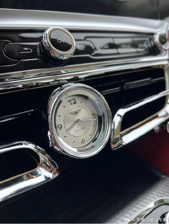 穆勒专属菱形压纹饰面中控台、贵族黑仪表板饰面,穆勒版专属定制中控标志,门板印有“B”标识、百年灵时钟,穆勒专属皇家棕骑配色方案、座椅滚边,穆勒标识座椅刺绣,3辐式双色加热真皮镶边方向盘,金色中控点缀。