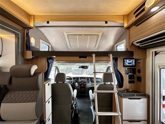 额头床在驾驶室的上方,额头床尺寸为:2210×1500mm,可以睡上两个成年人。床铺三面环窗,带来采光和通风效果。床头处有阅读灯、电源插座,便于乘客睡觉前使用。另外,额头床的床板是推拉设计,不用时可以推进去,这样就保证了驾驶室人员头顶有宽敞的空间。在额头床处是娱乐系统设计,厂家提供了两种选择方案,不喜欢固定电视机的用户可以选择投影仪,如果喜欢电视机直接预装电视机即可。