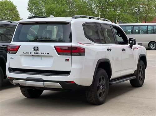 全新丰田兰德酷路泽GR SPORT车身侧面,平直的车顶线条以及贯穿式的腰线让车辆拥有大气的视觉效果,此外,黑化大尺寸轮毂视觉效果颇为夸张,整体营造出不错的运动感。相比车头,车尾造型更简洁,大量平直线条营造了SUV应有的扎实感,尾灯组采用动感的熏黑设计,外凸的后保险杠设计厚实。