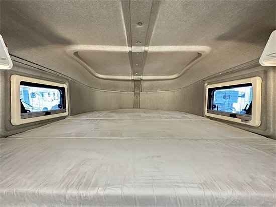 驾驶舱顶部设计了大尺寸的额头床,尺寸达1.7m×1.95m,可以满足两个大人和一个小孩在这里休息。在床铺两侧和顶部配有车窗,方便额头床区域的通风和透光,同时可以减少车友在这休息时的压抑感。