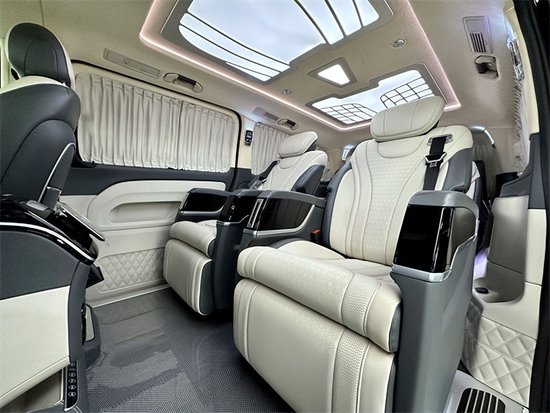 新款奔驰威霆平顶7座商务车采用了全新三幅式设计多功能方向盘,加装nappa真皮包覆,以及大量的高光橡木点缀,全车的座椅和内饰皮革采用的都是进口头层牛皮,保证了隔音性观赏性以及舒适感。中控部分采用奔驰V~Class的悬浮式中控大屏、巴赫钟表、车载冰箱等豪华配置。彰显着其奢华与舒适。