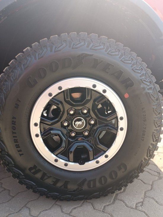 23款福特烈马Bronco还提供了16/17/18三种尺寸的轮毂可选,基础版车型为255 70/R16的全季轮胎;顶配车型预计装备315 70/R17的M/T越野轮胎。车身的离地间隙最高可达294mm,涉水深度高达850mm,通过角和离去角分别是29°和37°,数据非常可观。