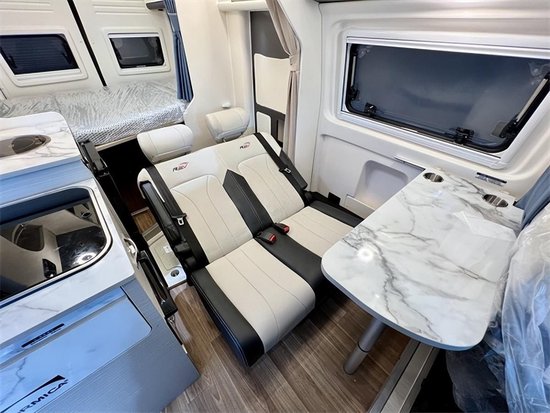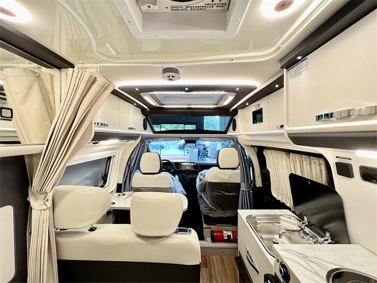 整车尺寸为5465mm×2080mm× 2480mm,搭载2.0T发动机,新款搭载了9AT变速箱,强劲的动力让起步和加速都有卓越的表现,全车使用大尺寸钢化玻璃天窗,让视野扩大,满天的景象一览无余。B型房车的外部配置基本都是比较简洁的,除了右侧上方的FIAMMA手动遮阳蓬和户外照明灯,就是水电接口和户外淋浴器了。两侧后方都做了拓展盲窗的设计,是为了扩大尾部横床的长度。高强度的硼钢车身,整车都做了保温隔热降噪。133-7022-6676