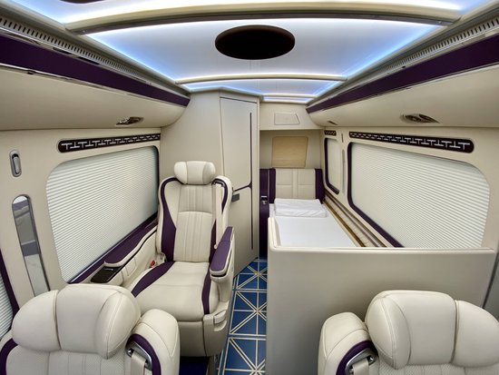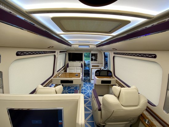 商务车内饰可以根据客户需求定制颜色、材料、音响和娱乐系统、加热和按摩座椅、空气净化、冰箱等各种配件。