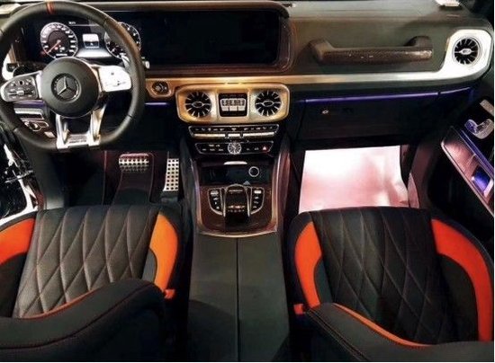 来到车内,从海外版实拍图来看整车的内饰采用了橙色的内饰主色调,辅助棕色的皮质在质感和年轻感之间做了一个平衡。而从官图来看,G900特别版和巴博斯G900普通版不同,采用四座布局,应该会在内饰的配色、材质方面有所区隔。