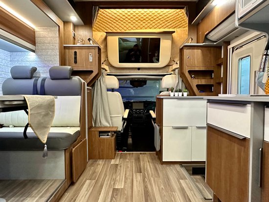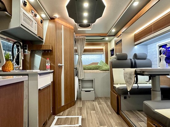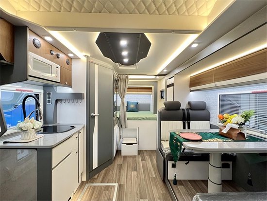 内饰布局采用C型房车常见的左侧+后侧的双拓展设计,车厢内前部高度为2120mm,拓展后内部尺寸宽阔。内饰采用欧洲工艺家具设计,整体选用免漆家具板+进口地板革+防火板台面等,旨在最大程度塑造家的感觉,保障房车内部高品质的居住使用空间。