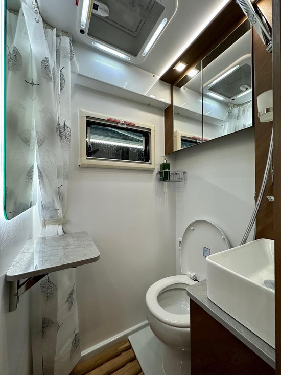 车尾主卧横置床完全拓出后尺寸更宽敞,尺寸为:2.1x1.3米,轻松睡下两名成年人,两侧外推窗形成良好的空气流通循环,采光效果也更佳,顶部吊柜上安装有一圈氛围灯带,暖黄色灯源尽显温馨。卫生间区域,采用一体式设计,内部还装配有赛特福德进口全尺寸游艇陶瓷电动粉碎马桶、卫生间陶瓷面盆+卫生间独立淋浴花洒、LED高清化妆镜+欧式储物镜柜、换气扇等。固定的洗漱台和陶瓷面盆设计提升内部质感,还有330升保温清水箱+43升保温灰水箱+56升保温黑水箱,旅途过程中能够随心所欲的用水,为车友带来舒适的使用体验。好了本款戴德E途PRO进口依维柯双拓展房车小峰哥就同大家介绍到这里。阅览世间美好,带您跨越山河,品味人间烟火,给您一个移动的家 -我是小峰哥