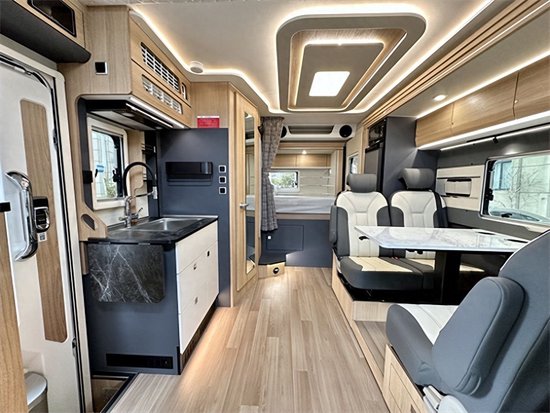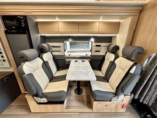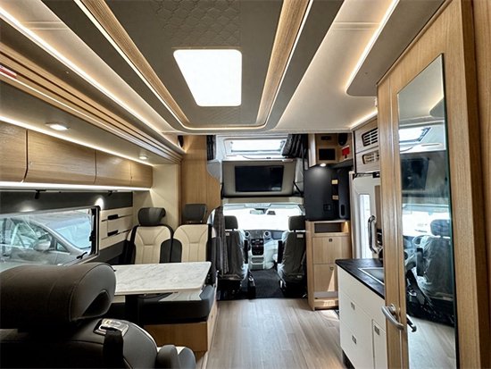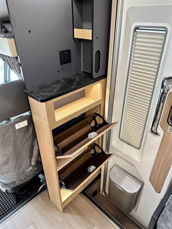 新内饰采用澳洲胡桃风格的设计,低调而奢华,非常有质感,给房车旅行生活提高了品质,还可以选装马拉加樱桃木风格内饰,车内布局从前往后依次为额头休息区、会客区+厨卫区,后方是尾部休息区,车内高度更是达到了2米。这个双人对坐的会客区小编非常喜欢,满足4人对坐的同时,其中一个座椅可以放躺。旁边墙壁上电源接口和USB接口非常多能够满足多个设备同时使用。