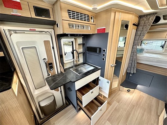 厨房区域台面设有翻折式延长桌板以及三合一水龙头不仅可以增加操作空间还能满足直饮水、冷水以及热水多种需要让你烹饪更加简单方便。台面下方配备储物柜可以放置厨具,容量充足且方便拿取。厨房对面配备了148L房车专用空调以及微波炉,让您在旅途中随时都能吃到新鲜热腾腾的食物。