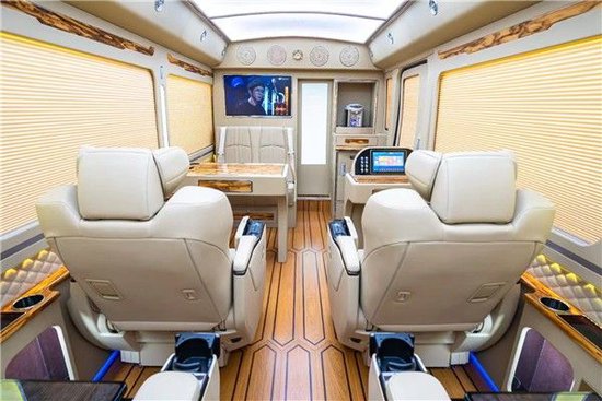 丰田考斯特车内配备了高档OTTOMAN意大利真皮航空座椅,并配置了电动脚托、电动靠背平躺。华通丰业考斯特内部航空座椅前部可配备一张真皮汇报席办公桌,桌面配以多媒体数据转换接盒,实现多功能移动办公与会议展示。丰田考斯特改装商务车内饰的改装上,还有许多不同的细节的设计。
