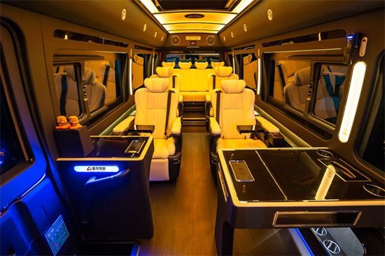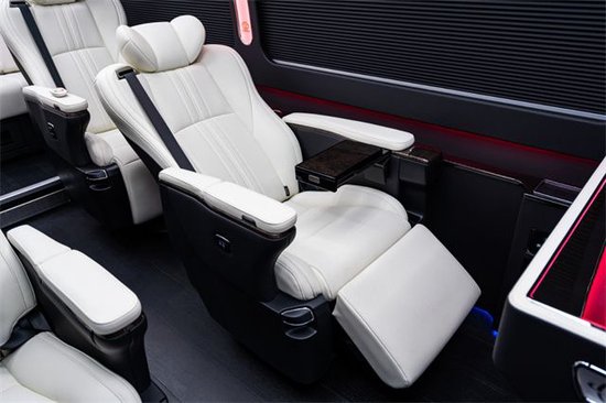 头等舱座椅采用高档环保皮革搭配儒雅灰菱格纹,彰显轻奢品质、高档更显尊贵,通风加热、电动脚拖、睡眠头枕等配套功能,提升乘坐体验,车内装饰采取简约风格,彰显整洁干练,全车柚木地板、车顶奢华氛围灯、BOSE音响、豪华雨伞、高端酒柜、电动车门等豪华配置让这辆车能够完美胜任商务接待的需求!