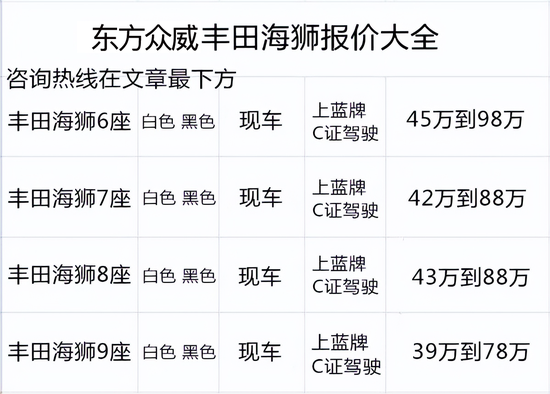 [丰田海狮4S店]丰田海狮6座价格48W-128W(北京东方众威原创)丰田海狮7座价格43W-98W 丰田海狮8座价格45W-88W (北京东方众威原创)丰田海狮9座价格38W-98W手续齐全当天开票全国上牌!丰田海狮外观颜色:白色、金色、黑色 内饰颜色:白色、米色、黑色、红色、棕色 全国上牌!全国上牌!