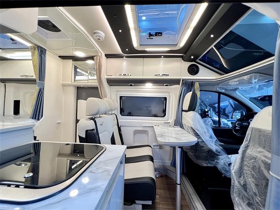 来到车内,首先看到的是驾驶室和休息区,风挡玻璃+头顶隐私采光窗+休息区天窗,让这台小车一点不压抑。副驾驶可以旋转,休息区的桌子配有延长桌板,和客户面对面签个合同相当ok。车内座椅均采用M1级别乘用车座椅,座椅前后靠背可调节,舒适性及安全性很有保障。