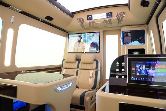 考斯特12座商务车安装了茶色密封防爆玻璃,隐私性极佳。它的内饰更是低调又不失奢华。4张埃尔法航空座椅的顶级配置,外加各种智能的功能支持。车内配备了高铁同款百褶电动窗帘,220V充电系统和无线充电基座,A380空客顶灯与可支持72种颜色变幻的氛围灯,下压式恒温空调风道,可以秒变双人床的四连座,实木地板拼接。