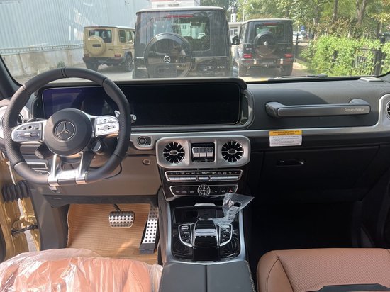 23款奔驰G (配置|询价)63内饰也有了全新的改变,最显现的变化在于采用了奔驰今年最新采用的设计理念,全液晶仪表盘和中控大屏一体的双12.3寸连屏格外引人瞩目,信息显示更加全面,无论视觉效果到操控体验都无可挑剔,体现出全新20款奔驰G63AMG科技时尚感。另外奔驰G系列标志性的三把锁的也不能忽视,位于两个涡轮状空调出风口之间,这也是奔驰G63AMG纵横越野界的利器。