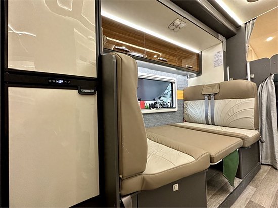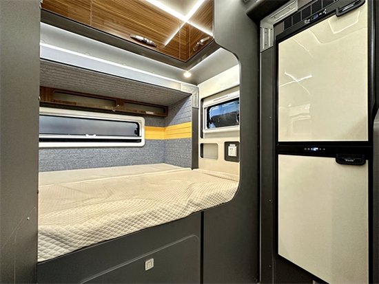 作为一款双拓展的车型,后方休息区域的空间自然也没得说,1.4*2.1m的横置双人床,能够轻松睡下两个成年人。这个区域的墙面都做有撞色翻毛软包,使得这个区域格外温馨舒适;三面环窗的设计,保证了这个区域的通透性。床铺上方还设计有吊柜,日常收纳使用也会比较方便。