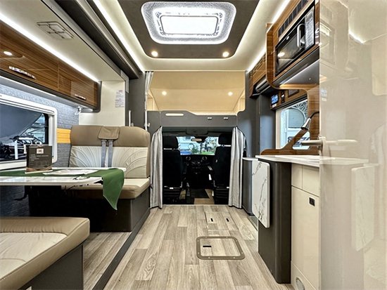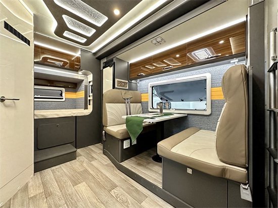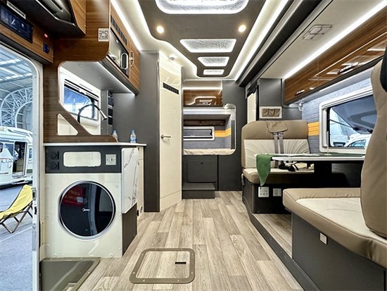 进入车厢内部,整体内饰基于北欧轻奢风格打造,深色系的配色带来层次分明的视觉感受,极具质感。磨砂灰搭配咖棕色系木纹板材的选择,也使得生活区域显得十分大气沉稳。车内采用经典的“驾驶室+额头床+会客区域+厨房区域+卫浴区域+尾部休息区”的布局,车内空间十分宽敞舒适。车内还配备有大1P变频空调,能够使室内时刻保持令人舒适的温度。