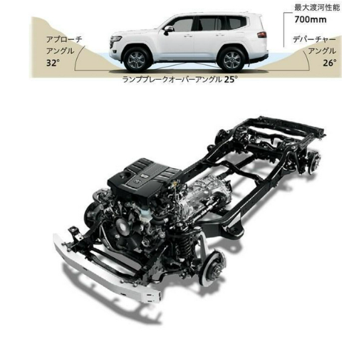 越野能力方面,LC300接角32度,离去角可达到26.5度,离地间隙为230毫米。丰田为LC300配备了自适应可变悬架以及更先进的多地形选择系统,而多地形监控系统则包含一个底部摄像头,提供全方位视野。同时还具备蠕行模式和坦克掉头功能。