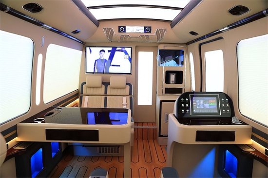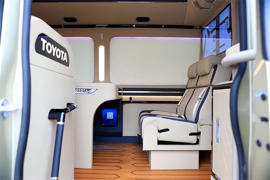 丰田考斯特移动办公室,会议室等功能,丰田考斯特车内搭载了丰富的办公设备和多媒体演示设备,例如车载电脑,车载打印机,卫星通讯,蓝牙设备,移动WiFi等等,方便在出行的过程中遇到紧急事情可以在车内或者进行远程会议!