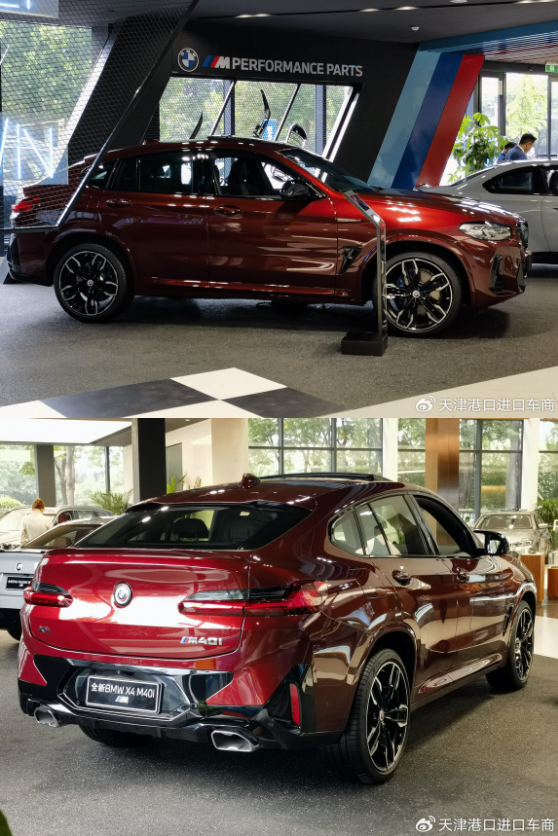来到车身侧面,宝马X4M车身尺寸是4767MM*1927MM*1633MM,溜背式的车身造型,侧裙位置还配备有独特的车身拉花,搭配上星芒式的熏黑轮毂造型,营造出不错的运动氛围,尾部小鸭尾的造型,分体式的灯光熏黑处理,下方还配备了扩散器,双排四出的排气的气势感十足。