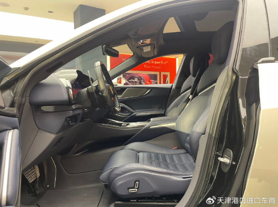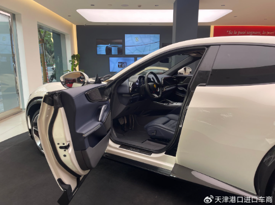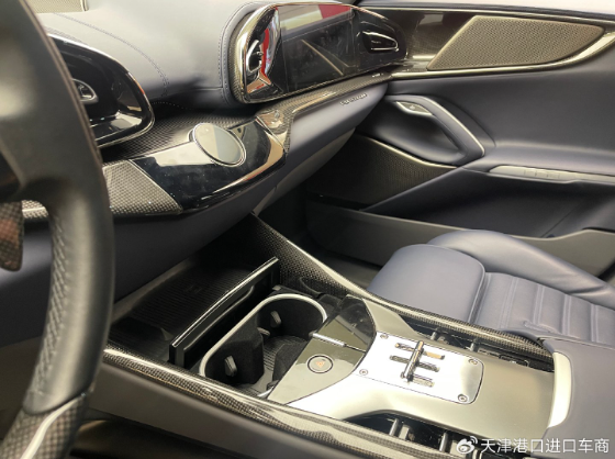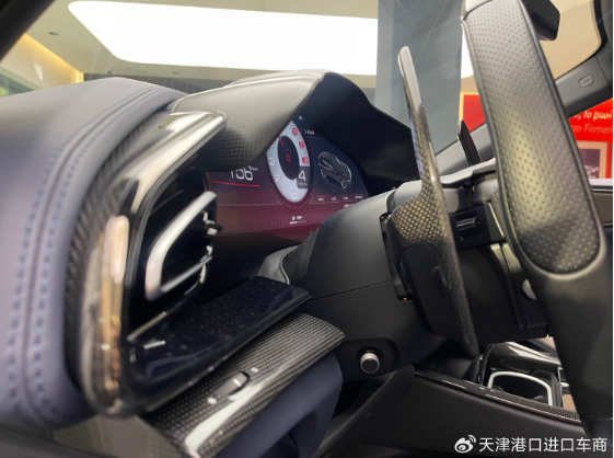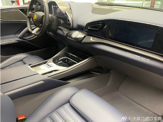 车内并没有普通汽车传统意义上的中控屏,整个座舱呈现出海鸥展翼般的对称造型,中间仅显示部分空调信息及必要的操作区域。拨杆式的换挡机构在滑轨造型上向手动挡车型致敬,这也是近年来法拉利车型的一大特色设计。车门上扶手采用了Y字形结构,车窗升降等按键被巧妙的设计的较为隐蔽。中间部分则设计有玻璃双杯架、无线设备充电区以及部分储物区,相较传统的法拉利车型表现出更强的实用性和豪华感。