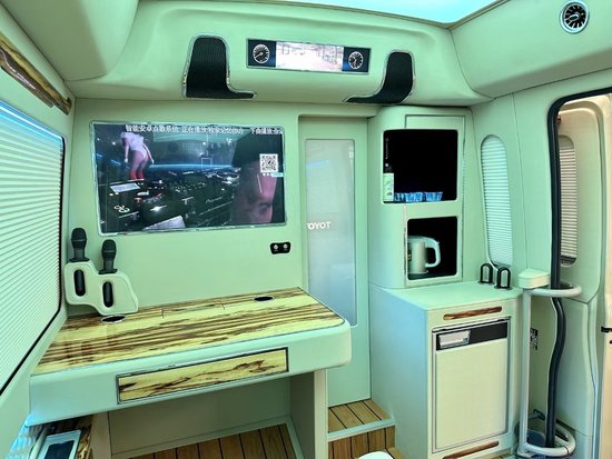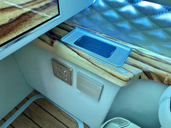 整车共有两个小桌子,可以用作日常的办公文件处理。侧墙上的无线充电,五孔的插座,USB的接口全部都有接上,方便出行,方便工作。