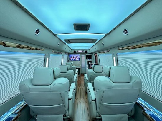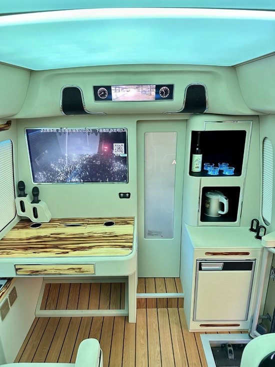 这是一台全隔断的纯10座版本布局的商务用车,做得是全隔断的布局,中间的小门是可以电动打开的,而且玻璃可以雾化,隔断的好处多多,可以使前后舱互不影响。大屏幕的电视机也是连接网络的,车载WiFi即可使用,额外还升级了音响以及低音炮,使车内的音响效果做得绝佳,因为电视上还安排了KTV娱乐唱歌系统,车内也能够想唱就唱。