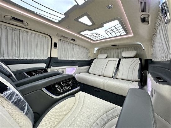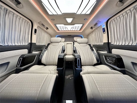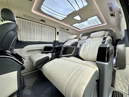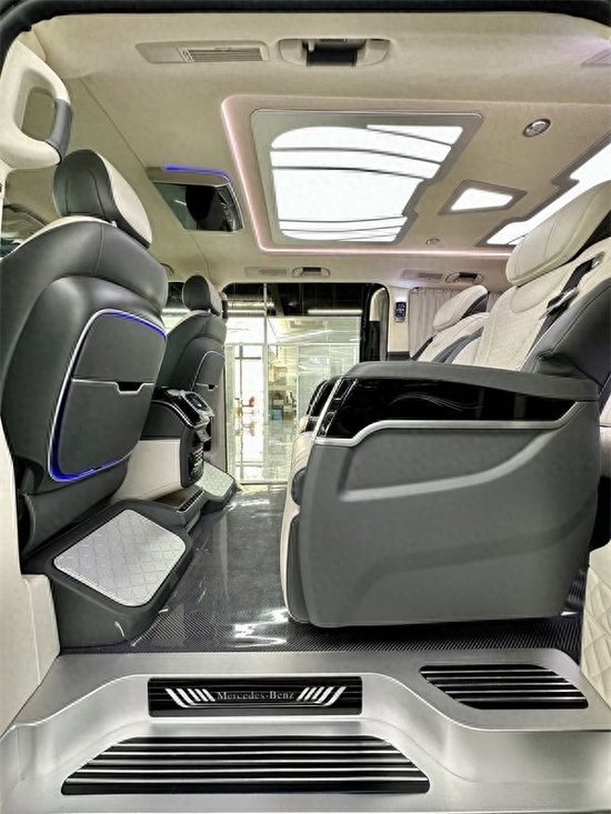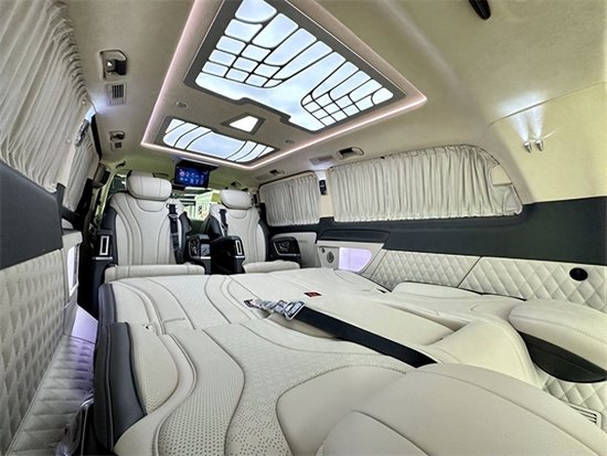 后排三座座椅更像是一个多人沙发了,座椅可以通过触摸屏控制直接展开成床,无论是短时间的休息还是孩童的玩耍都是不可多得的场所。车顶灯的设计也和车内的风格设计如出一辙,现代简约风格,由条灯和环形灯带营造出的车内氛围还是相当不错的。好了本款奔驰威霆定制版平顶七座商务车小峰哥就同大家介绍到这里。阅览世间美好,带您跨越山河,品味人间烟火,给您一个移动的家 -我是小峰哥