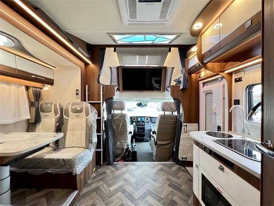 进入生活区域,白色和棕色木纹配色相得益彰,是偏美式的装饰风格,搭配暖色系的灯光,整体看起来十分温馨。家具也均为进口E0级环保标准房车板材,护卫乘客的健康安全。由于是双拓展的设置,我们可以看到内部空间十分大,最大程度提升了房车的生活质量。布局方面,采用了C型房车常使用的布局,由额头床、会客区、厨房区、卫浴间、睡卧区组成,各区域配置齐全,让乘客享受高品质的房车生活。