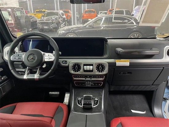 2023款全新奔驰G63前悬改为双插臂独立悬挂、电子助力转向、更大的内部空间、新仪表盘和多项奔驰最新的电子安全系统。车体增宽了122mm,轴距增加40mm达到2890mm,整车加长了53mm。内饰用料非常的讲究,新车内部采用了高档地毯、钢琴黑饰条和皮革座椅,营造了一个十分豪华的内饰氛围。中控台上的按钮比较的多,由此可见他的配置非常的丰富。双屏幕布局的运用,使得内饰档次感和精致感均有了提升。红色装饰的黑色座椅相当的动感,门板、中控台、仪表板、座椅和方向盘等都是手工缝制,彰显出了无与伦比的高贵气质。