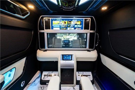 丰田海狮整车升级了加强型的隔音隔热处理,车内带空气净化系统,无线充电系统。在进门侧加装了氧化铝脚踏带迎宾灯的,华通丰业整车都是采用纳帕级皮质进行包覆的,侧壁红木装饰,手动百褶窗帘,后舱暖风系统,最后说说棚顶灯光,这个有智能触摸控制系统。灯光超级棒。