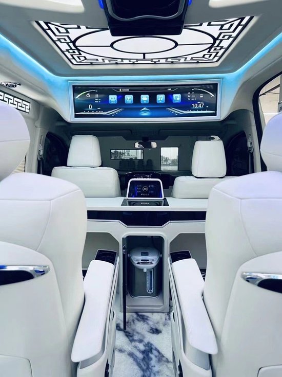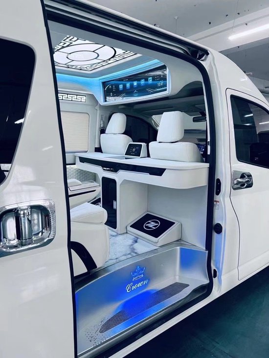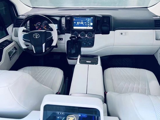 丰田海狮整车升级了加强型的隔音隔热处理,车内带空气净化系统,无线充电系统。在进门侧加装了氧化铝脚踏带迎宾灯的,华通丰业整车都是采用纳帕级皮质进行包覆的,侧壁红木装饰,手动百褶窗帘,后舱暖风系统,棚顶灯光,智能触摸控制系统。埃尔法同款独立航空座椅具备(通风,加热,腿托,旋转)等功能。
