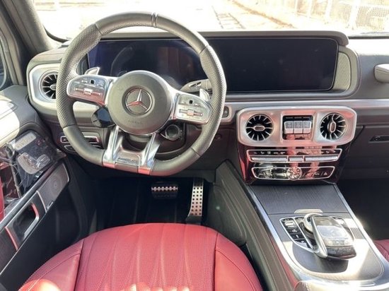 G63内饰方面,新G63保留了新G500的整体设计,除配色差异外,新车还换装了全新造型的平底式运动方向盘,其两侧配以打孔皮质包裹,下部镀铬装饰的造型也与新G 500明显不同,看上去十分战斗。此外,全液晶仪表盘+中控大屏的双12.3英寸屏幕设计在新车上也没有缺席,营造出了浓郁的科技感。