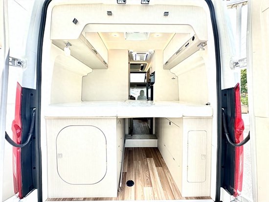 得益于外扩的盲窗,后横床的尺寸达到了2050成1350mm,完全媲美C型房车的床铺尺寸,这个尺寸的床铺在同类型的B型房车上,几乎是见不到的。双开的后尾门装有两个窗户,对于后床铺的采光也有保障。整车水电控制面板位于中门上方,使用便利。在水路方面,配备130L净水箱、60L灰水箱,由进口5Kw埃贝赫燃油暖风热水一体机提供热水和暖风,且带有高原模式。在电路方面,配备400Ah瑞弗原厂锂电池、3000W充逆变一体机,最多可以选装610W太阳能板。瑞弗原厂锂电池具有低温加热功能,-40摄氏度可以正常充电,在-20℃~55℃之间可以正常使用。