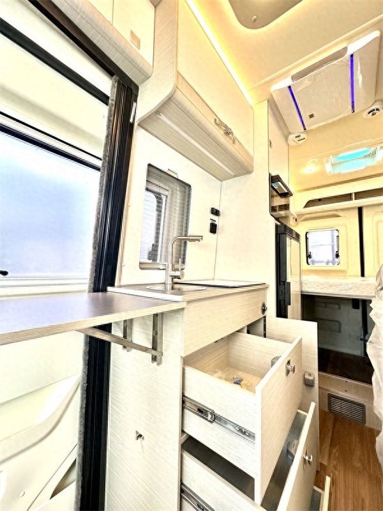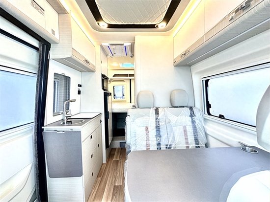 车内采用单排座椅卡座和后横床的布局,厨房和卫生间分布在中间区域的两侧。厨房台面内嵌带砧板洗菜盆、高弯水龙头、电磁炉,侧方带延展桌板。厨房的上部是12V直流变频空调。车内配备米家微波炉、85L双开门车载冰箱。在微波炉上方及冰箱下方各有一个储物柜,顶部配有多个通风天窗,满足车内空气净化需求。对于B型房车而言,尽可能多的储物空间非常重要。过道最宽处能够达到53公分。顶部配有美国MAX双向换气扇,在行驶中可使用,是非常实用的配置,建议大家的车内都配备。过道区的另一侧是一间一体吸塑式的卫浴室,宽75公分,进深70公分,高1.9米,一个成年人洗漱还是完全没有问题的,配备了马桶,淋浴花洒,可翻折的洗手池和带玻璃门的储物吊柜等设施,完全可以满足出行的洗漱需求。