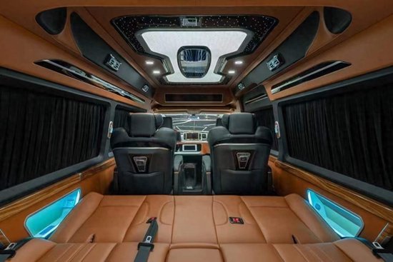 然后顶棚,大家看一眼这个顶棚的造型其实很别致,也很漂亮,整车的窗帘采用的是百折帘,隐私性是非常非常好的,就是说你在里头看看外头是非常清楚的,外头看里头是啥也看不见的,这就是一辆商务车应有的样子。然后后排这个沙发床再展示一下,因为这个沙发床是可以放倒的,桌板是可以收起来的,这个是它的一个壁灯