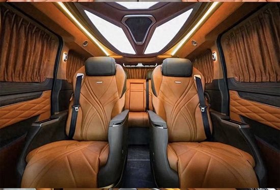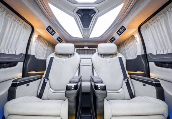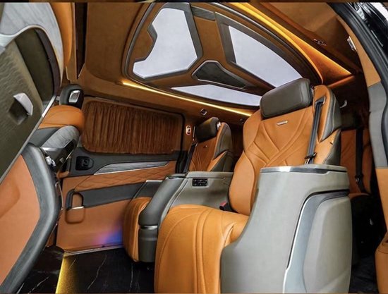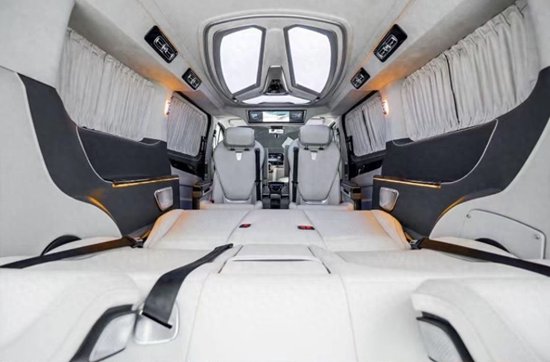 在座椅上面也是在不断地更新换代,目前所用的座椅都是第三代座椅了,中排座椅有8项电动调节,通风,加热,按摩,旋转,腿拖等等,这些都是属于一款好商务的基本配置了,而且在腰部支撑和腿拖方面都是采用人体工程学,在第二排座椅的后背也额外增加了电动调节,方便了第三排的乘坐者。第三排是三连排的沙发床,可以180度的放平平躺,跟原来的配置一样,但是在座椅的乘坐性上面做了更加深度的包覆,乘坐感拉升了一个档次。