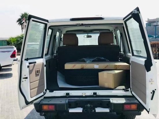 配置:23款LC76 沙漠黄灰 配置:桃盘,真皮,绞盘 涉水喉 详细配置:绞盘 涉水喉 5速手动变速箱 130升油箱 分时四驱 前差速器 后差速锁 16英寸合金车轮265/70R16 刹车:前盘后鼓 前悬螺旋弹簧 后悬板弹簧ABS+VSC+BA+EBD+HAC+ATRC 2气囊 彩色保险杠,黄车黑杠)高位刹车灯 、镀铬外后视镜带电动调节 侧踏板 数字时钟 5座 空调 电动门锁 电动车窗 、收音机 CD 蓝牙 2个扬声器 胎压监测 USB快速充电 前雾灯 后雾灯 手套箱带钥匙 日行灯、徽章 黑色轮眉 散热格栅彩条