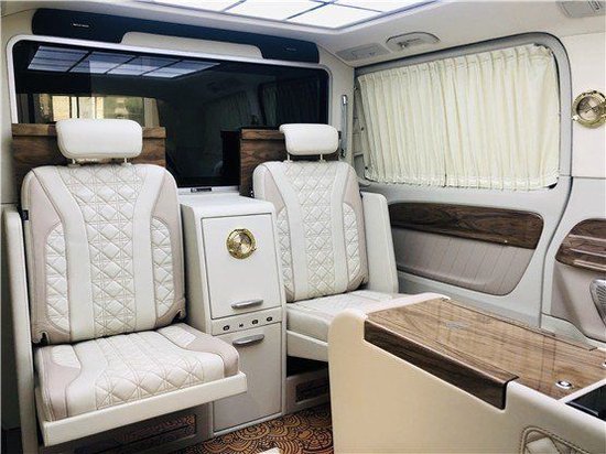 奔驰V260L改装隐藏六座内饰商务配置:● 电动双侧滑门● 迎宾式铝镁合金雨伞架● 电动座椅一键式展开3级记忆功能(通风,加热,气动按摩)● 吧台隐藏式反向座椅● 天鹅绒窗帘电动调节,对开● 进口意大利阿尔坎塔拉麂皮绒车顶车侧● 电动伸缩航空铝制小桌板带隐藏式电脑●现代奢华感酒柜● 稀有珍贵橄榄树瘤+环保皮侧包围面板● 进口级游艇豪华电子钟表● 原厂迈巴赫九宫格顶灯,氛围灯+多功能小天窗● 全车稀有珍贵橄榄树瘤铝制带激光雕刻花纹地板● 采用美国大能隔音底盘● 全铝合金6格挂衣架